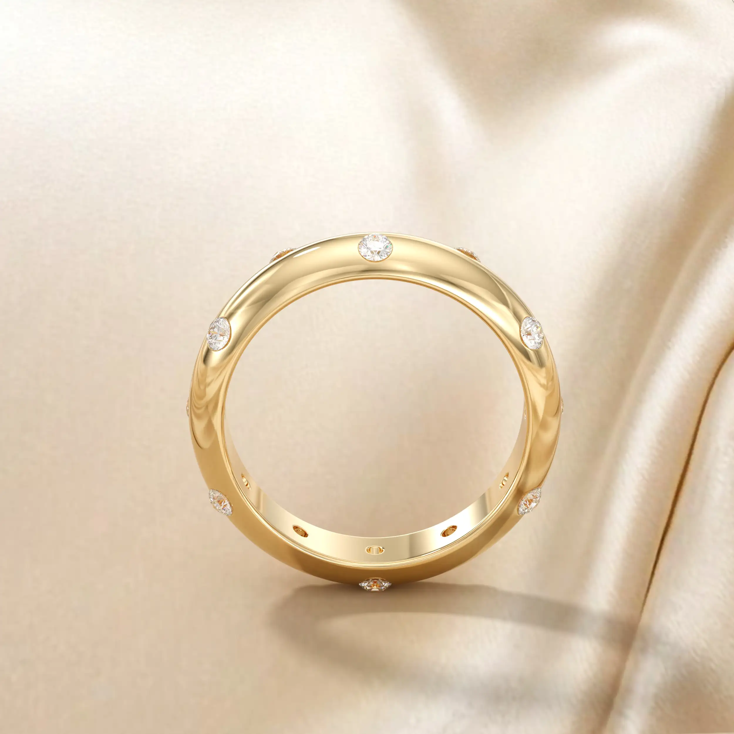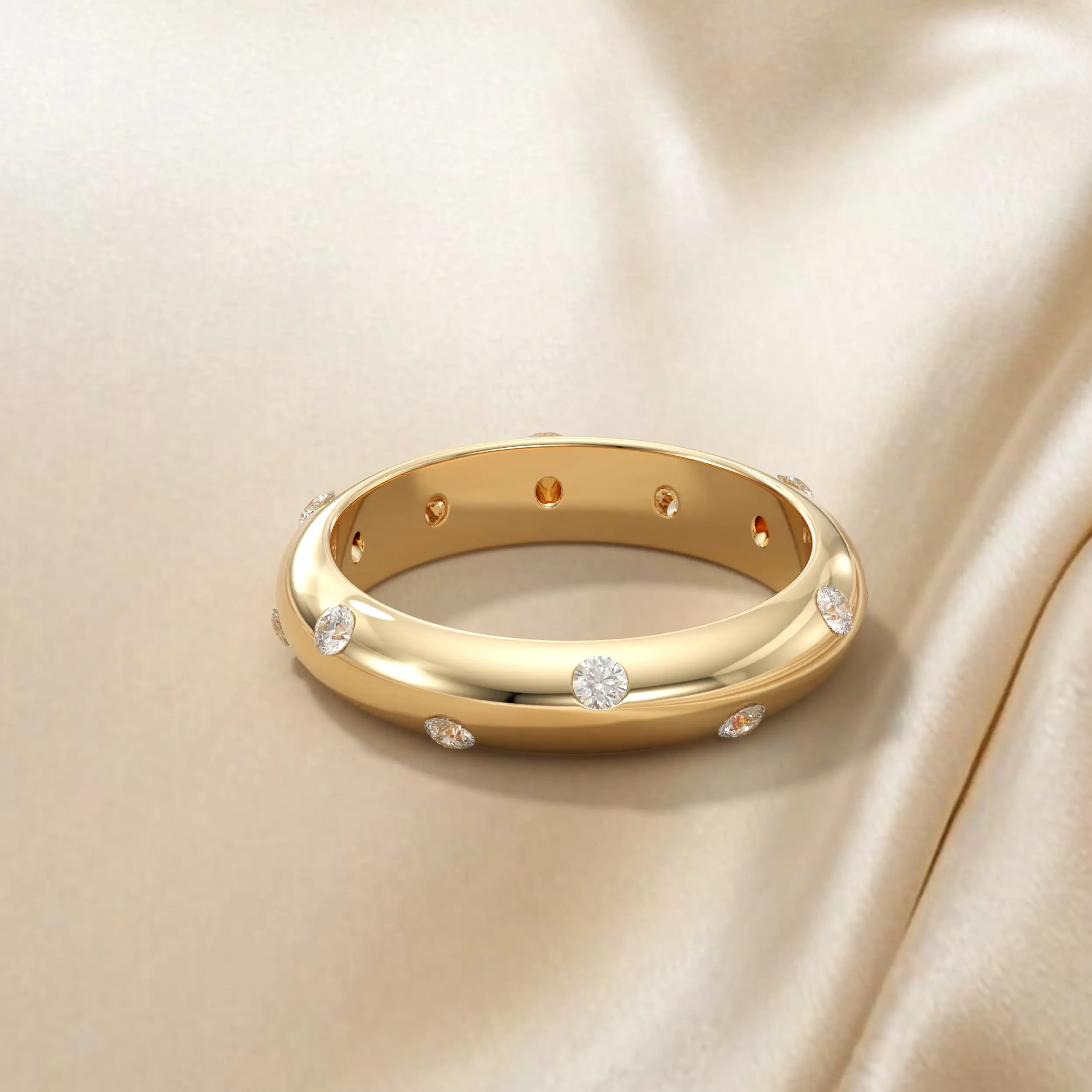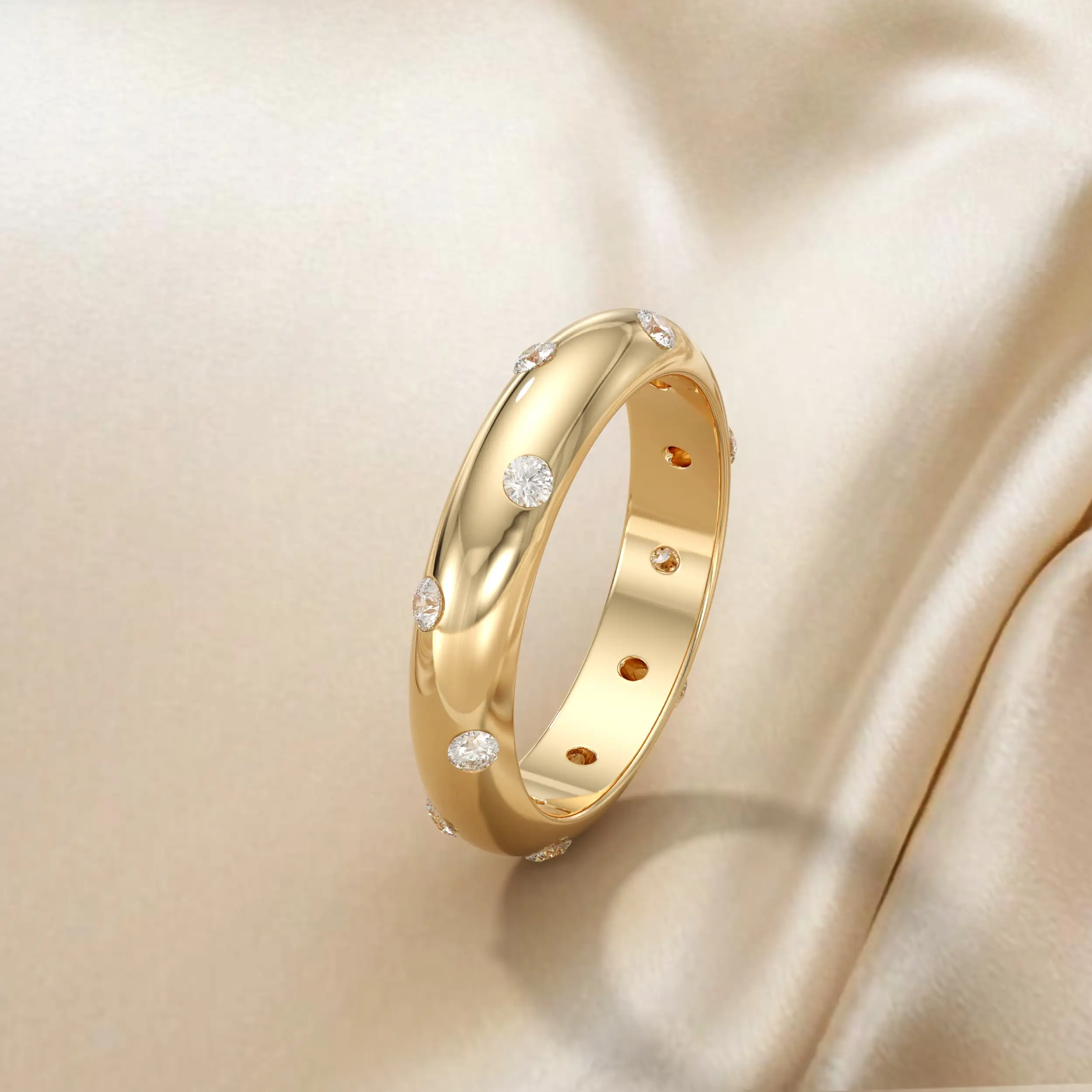 טבעת בנד בפרופיל חצי עגול בשיבוץ יהלומי מריחה. משולב כסט עם עגילים.