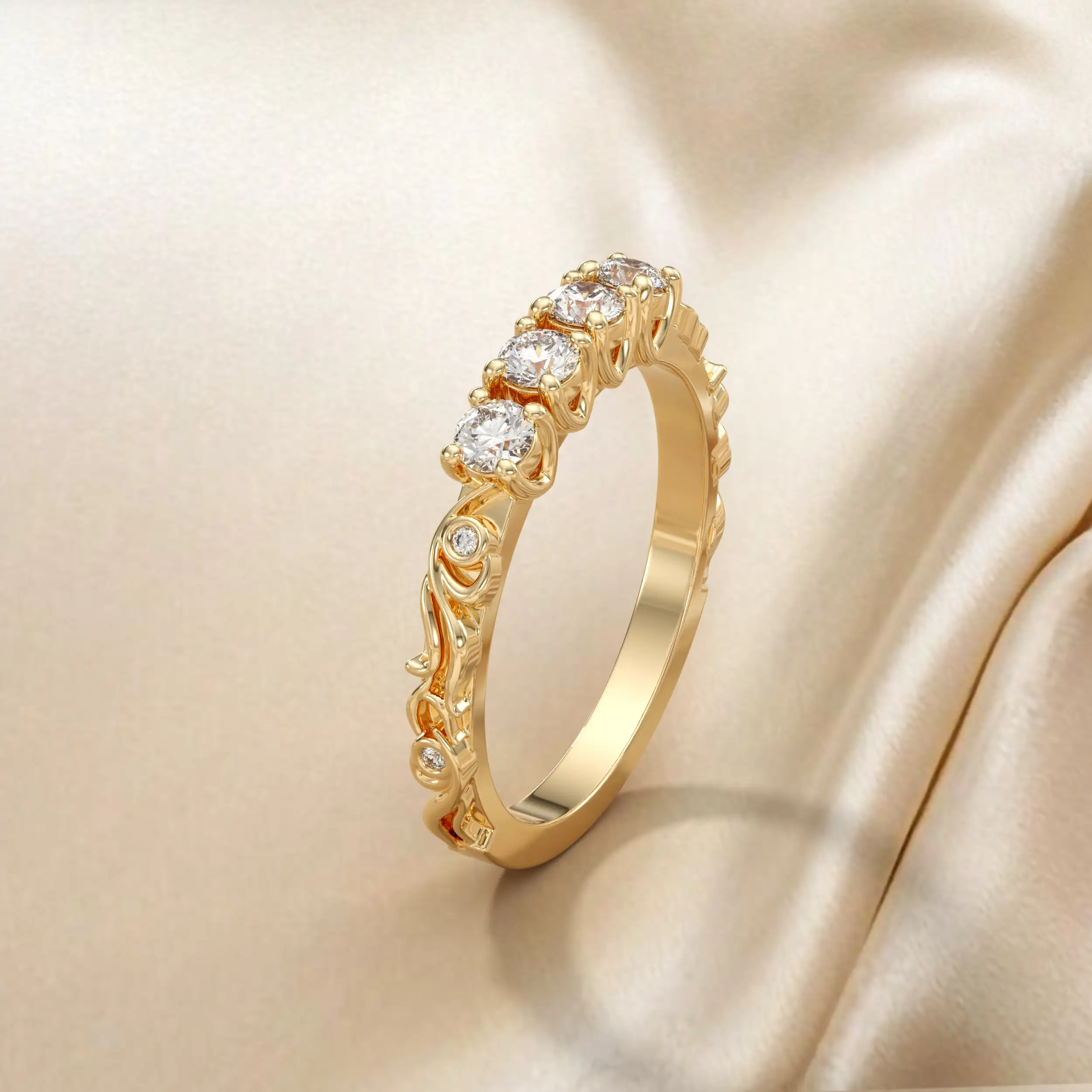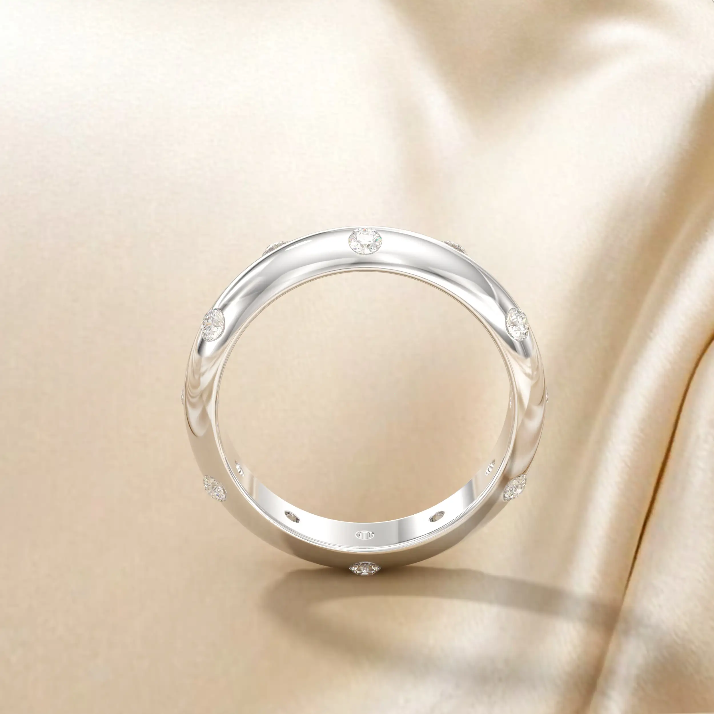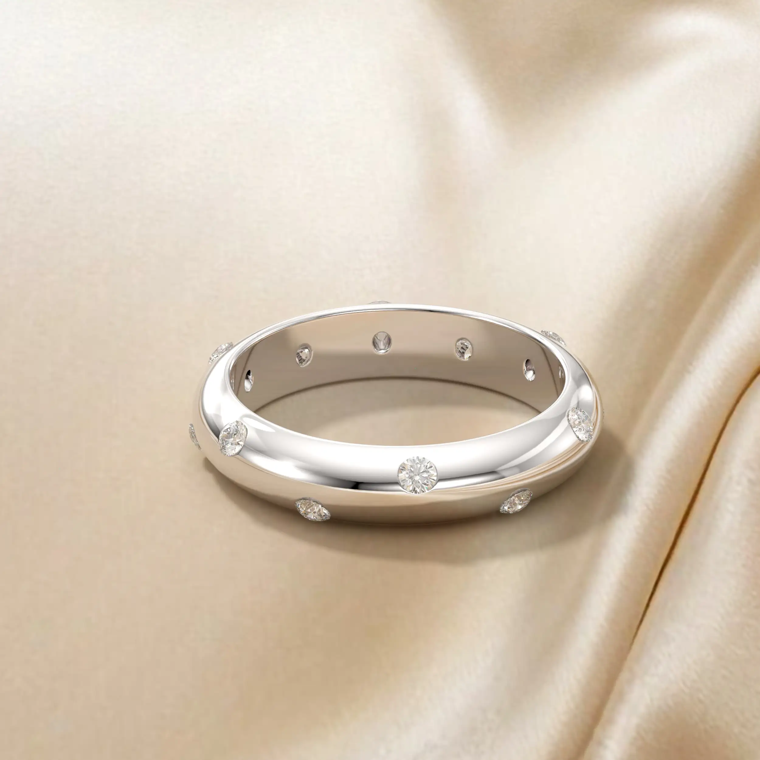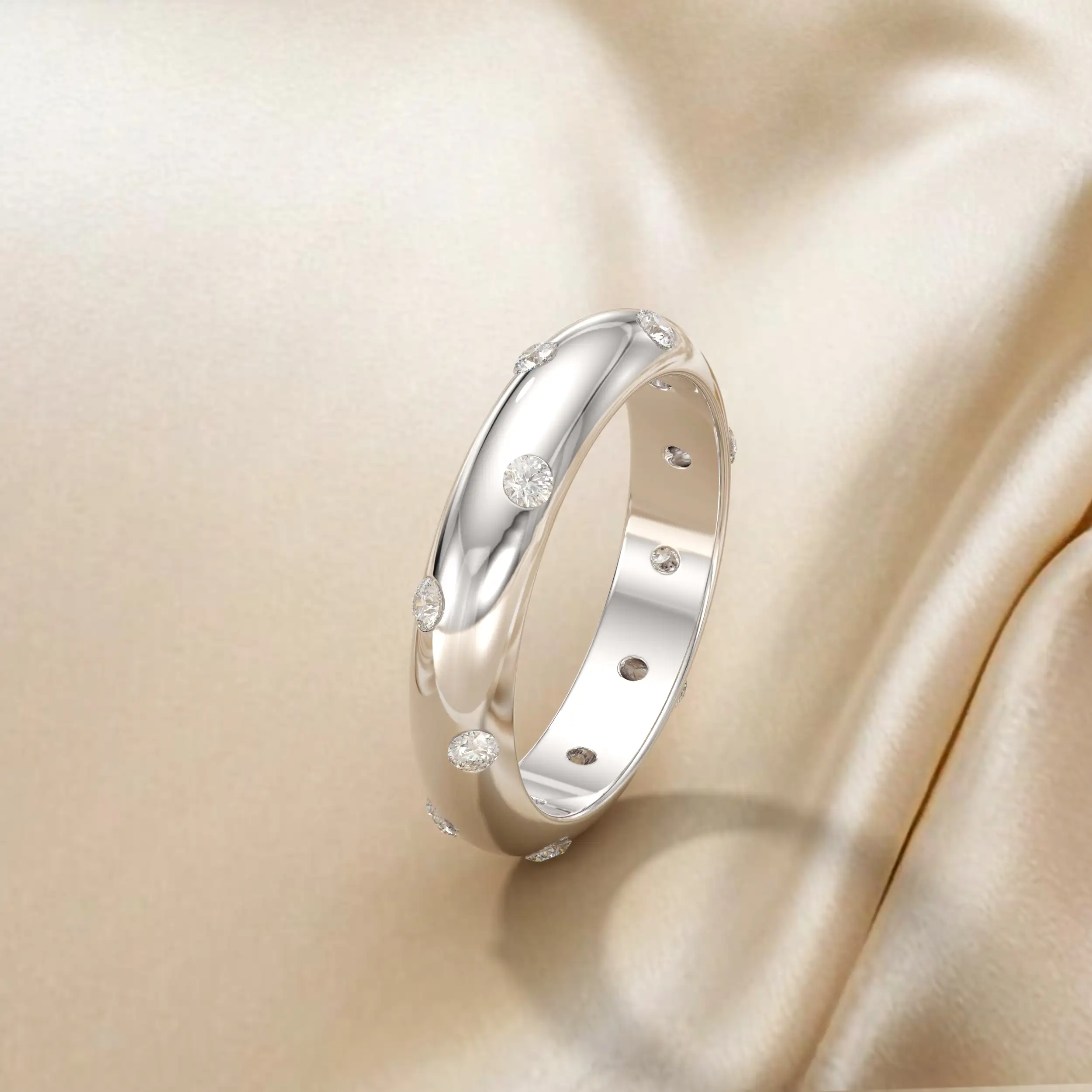 טבעת בנד בפרופיל חצי עגול בשיבוץ יהלומי מריחה. משולב כסט עם עגילים.