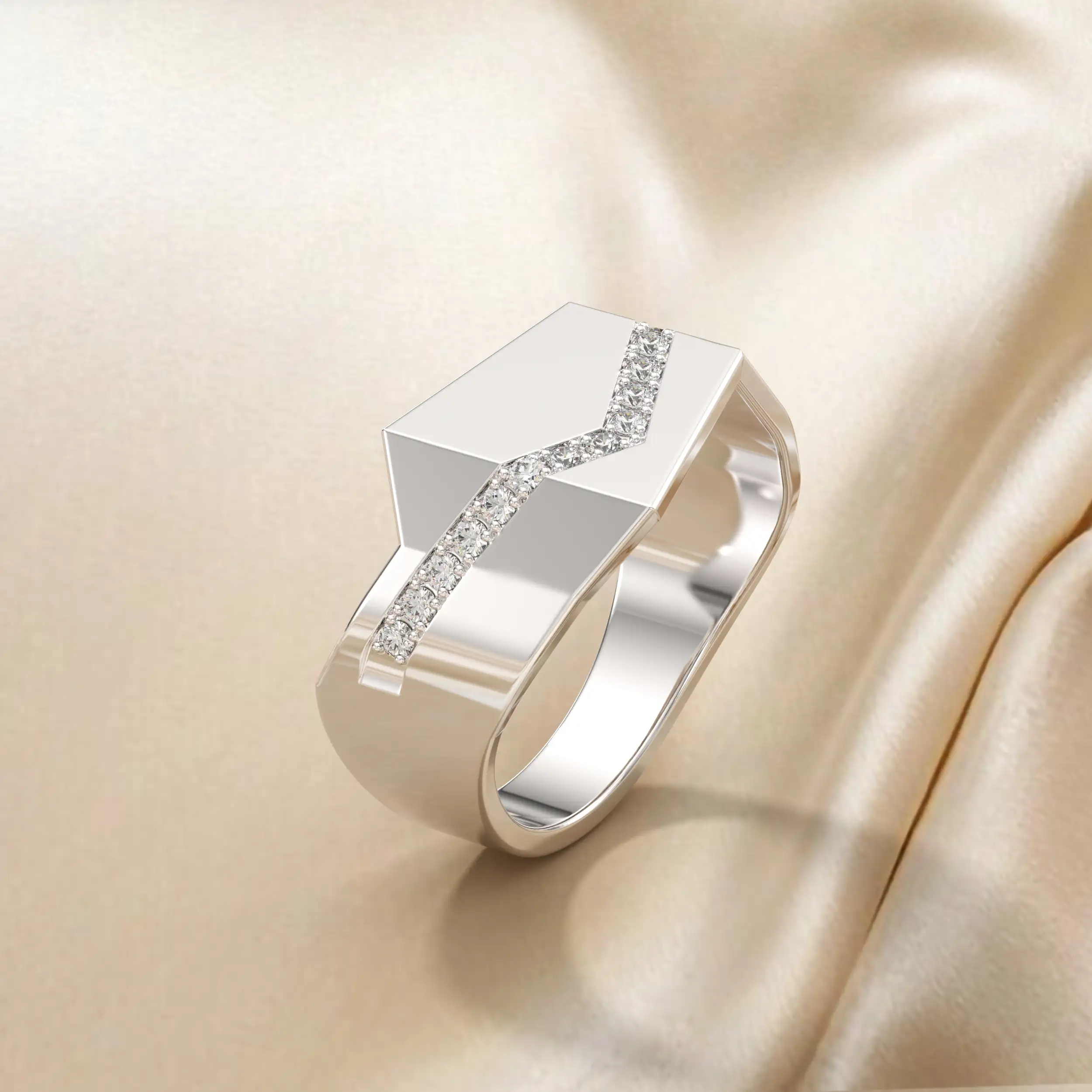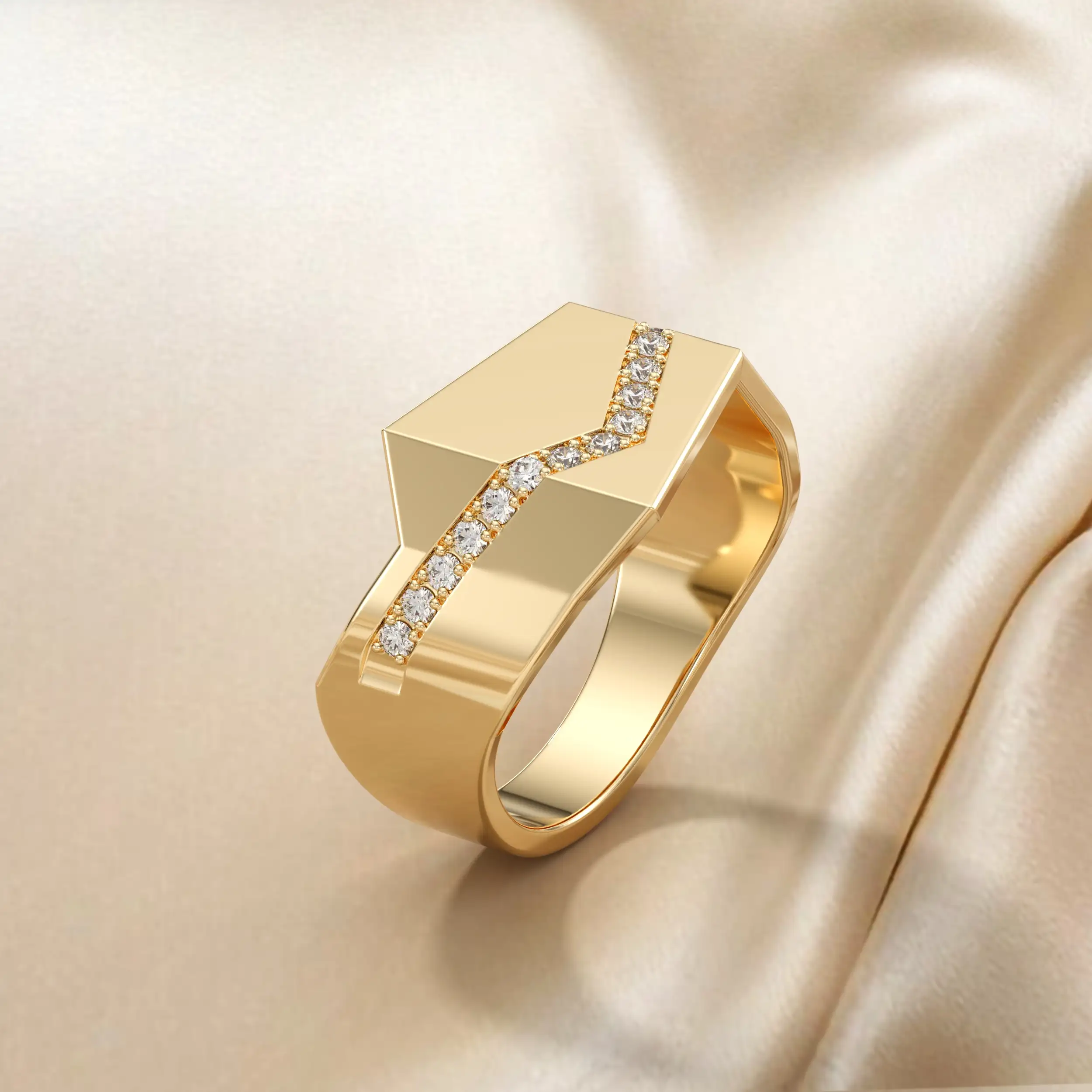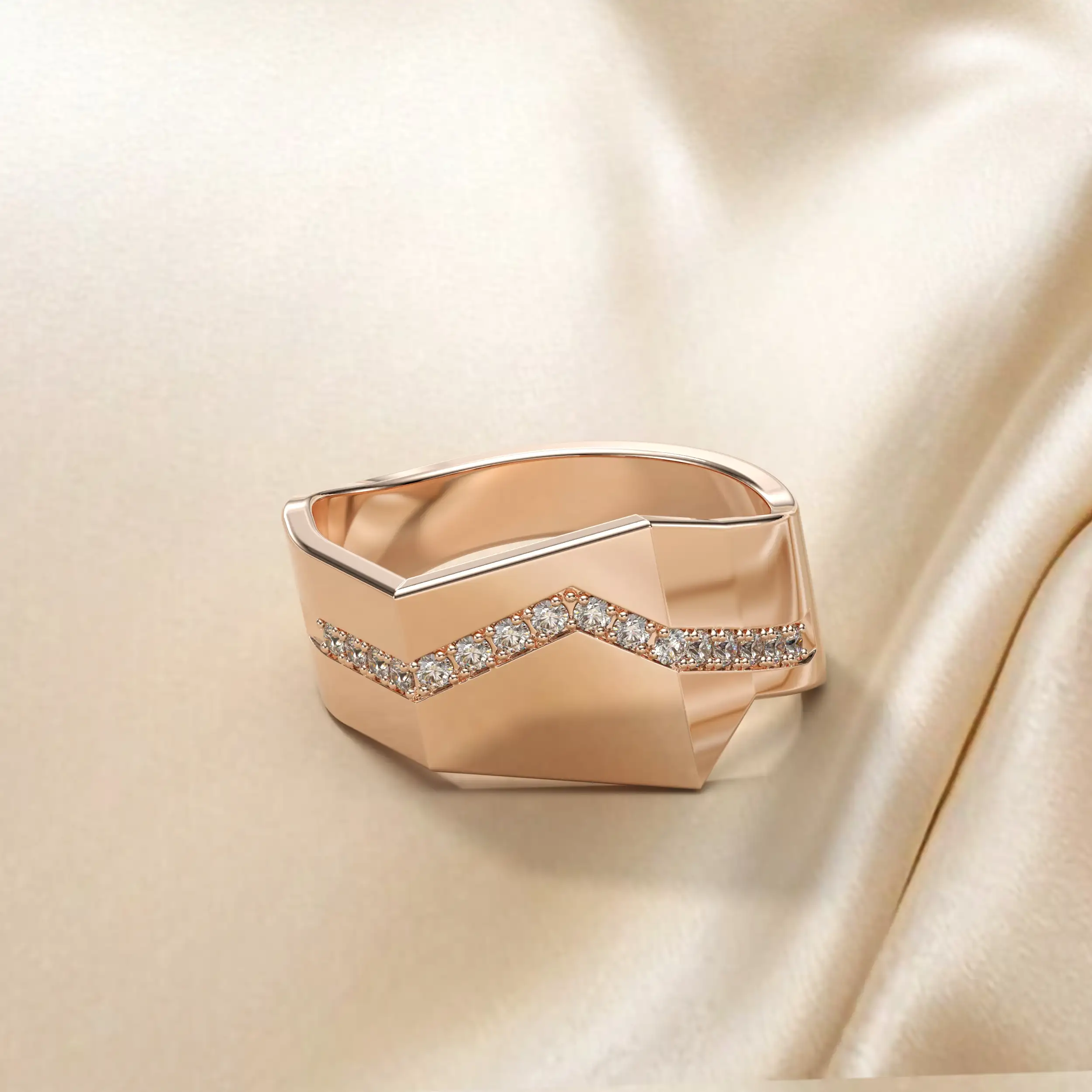 טבעת בצורה גאומטרית בעיצוב יוצא דופן, בשיבוץ קל של יהלומים.