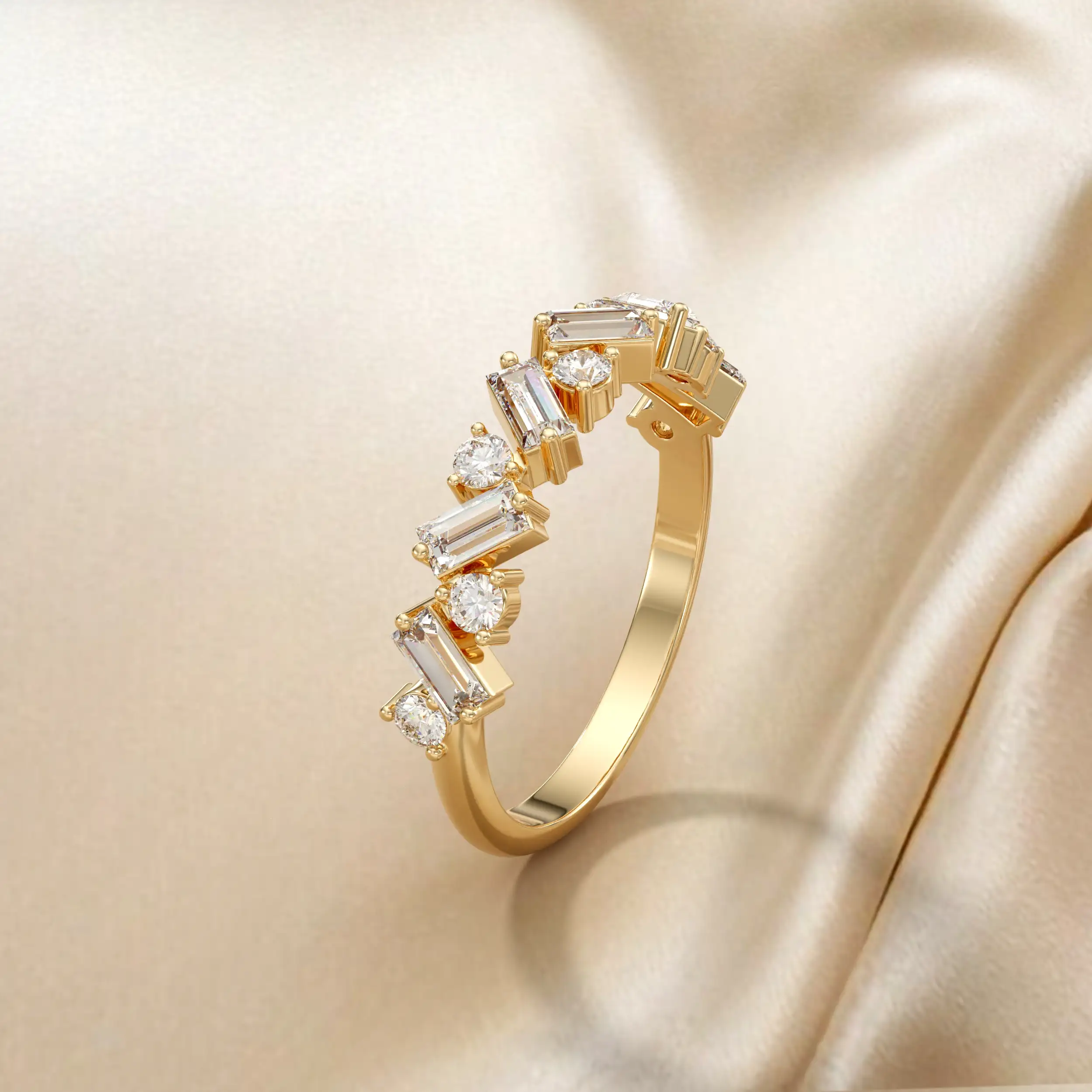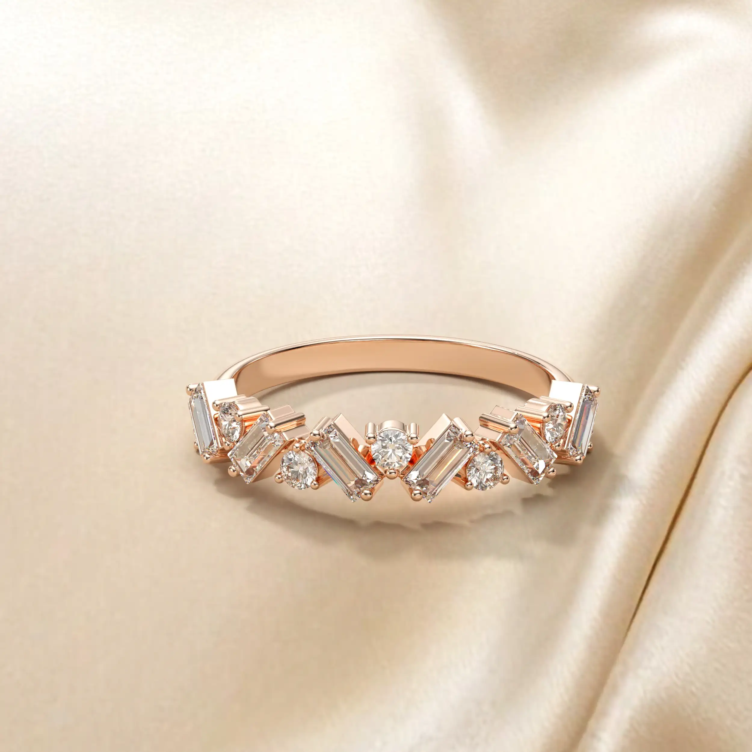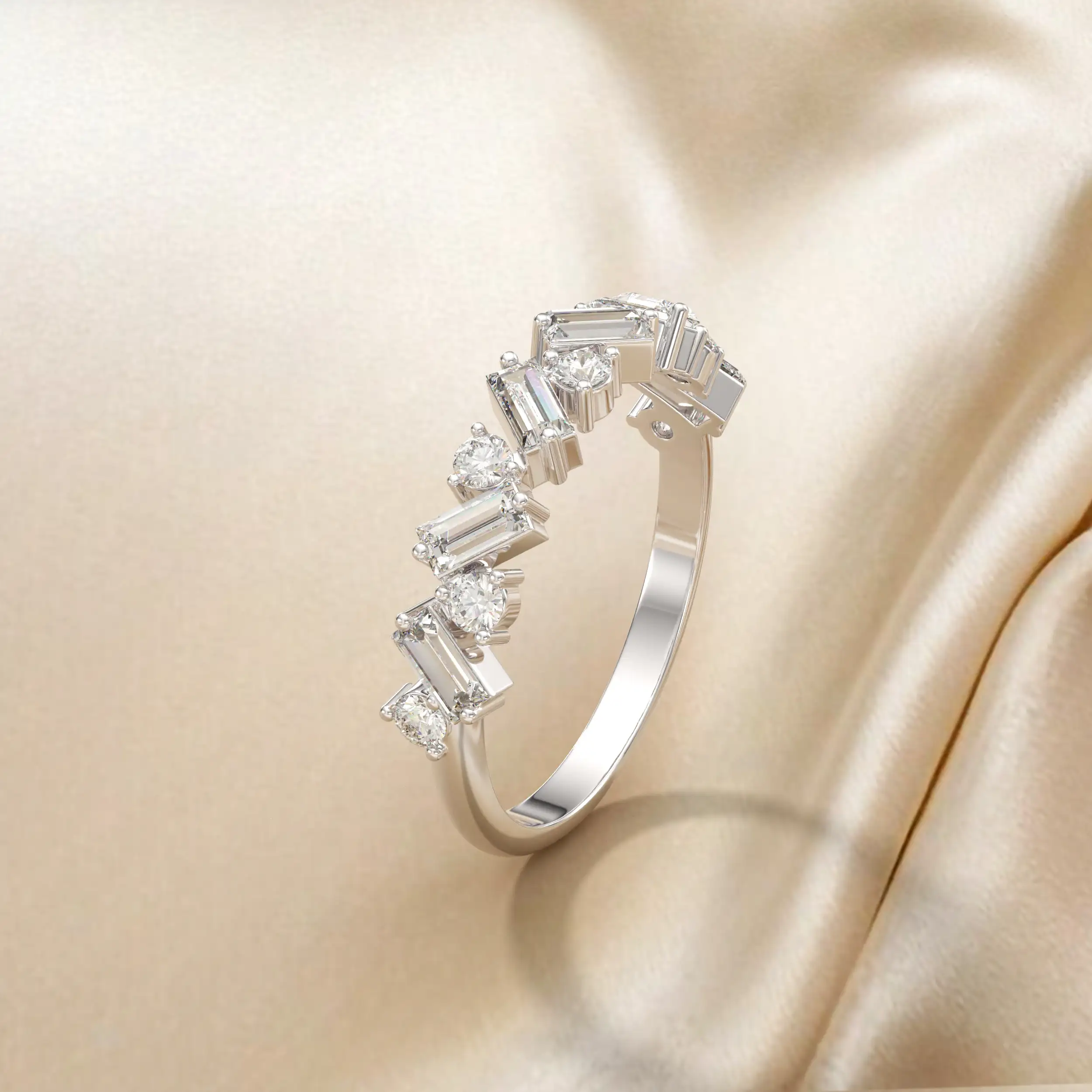 טבעת סופר מיוחדת בשיבוץ יהלומים מלבנים ועגולים. משתלבת נהדר לאירוע ערב.