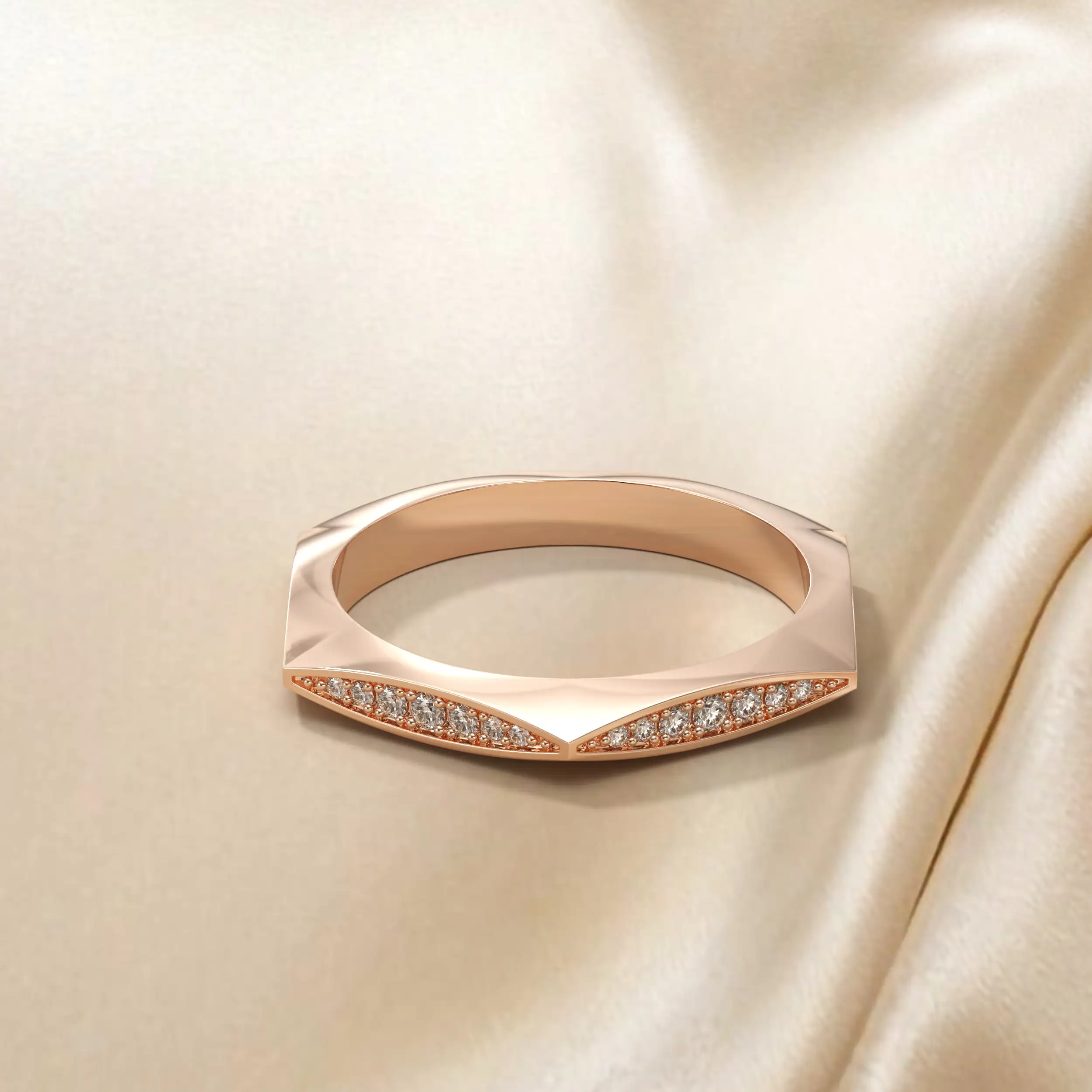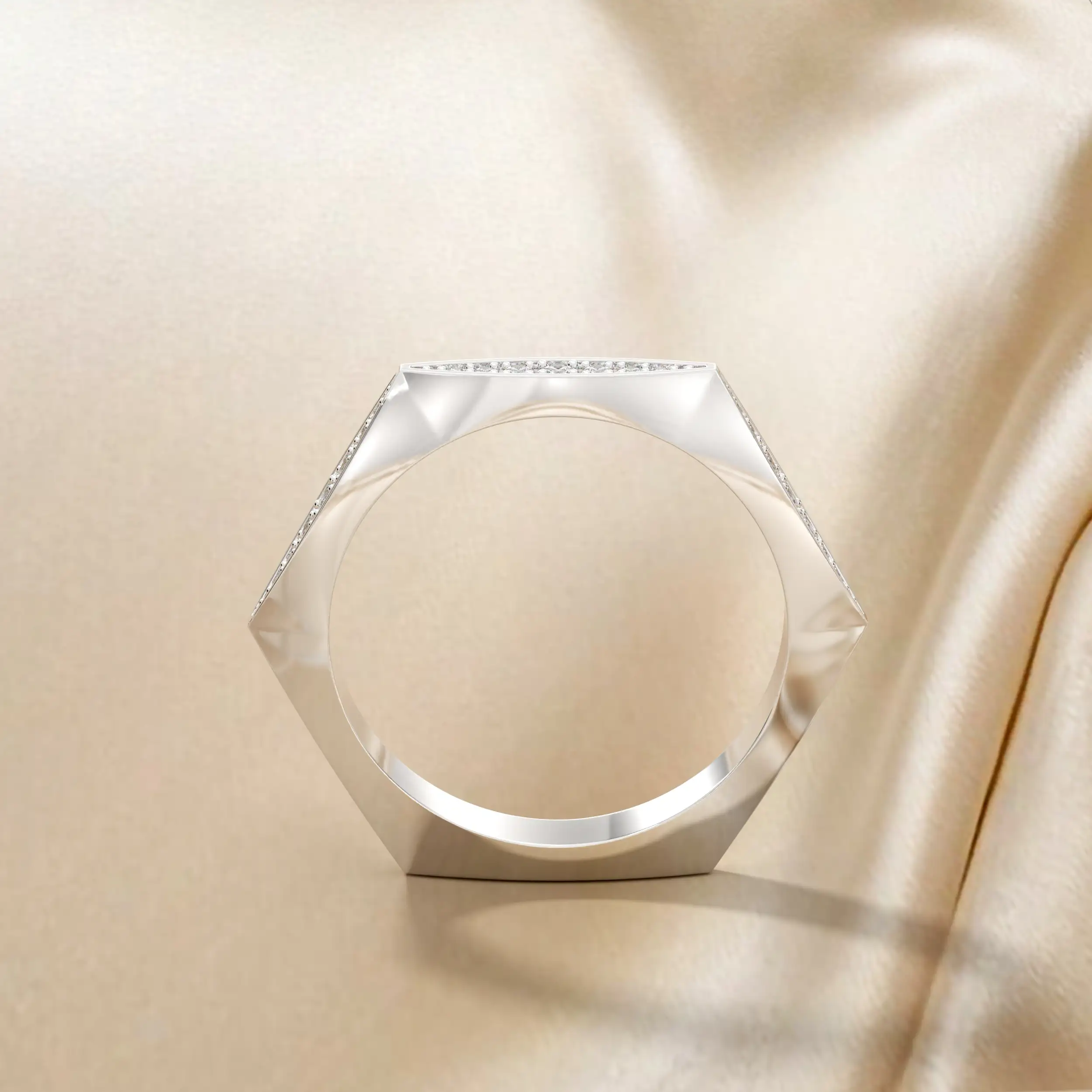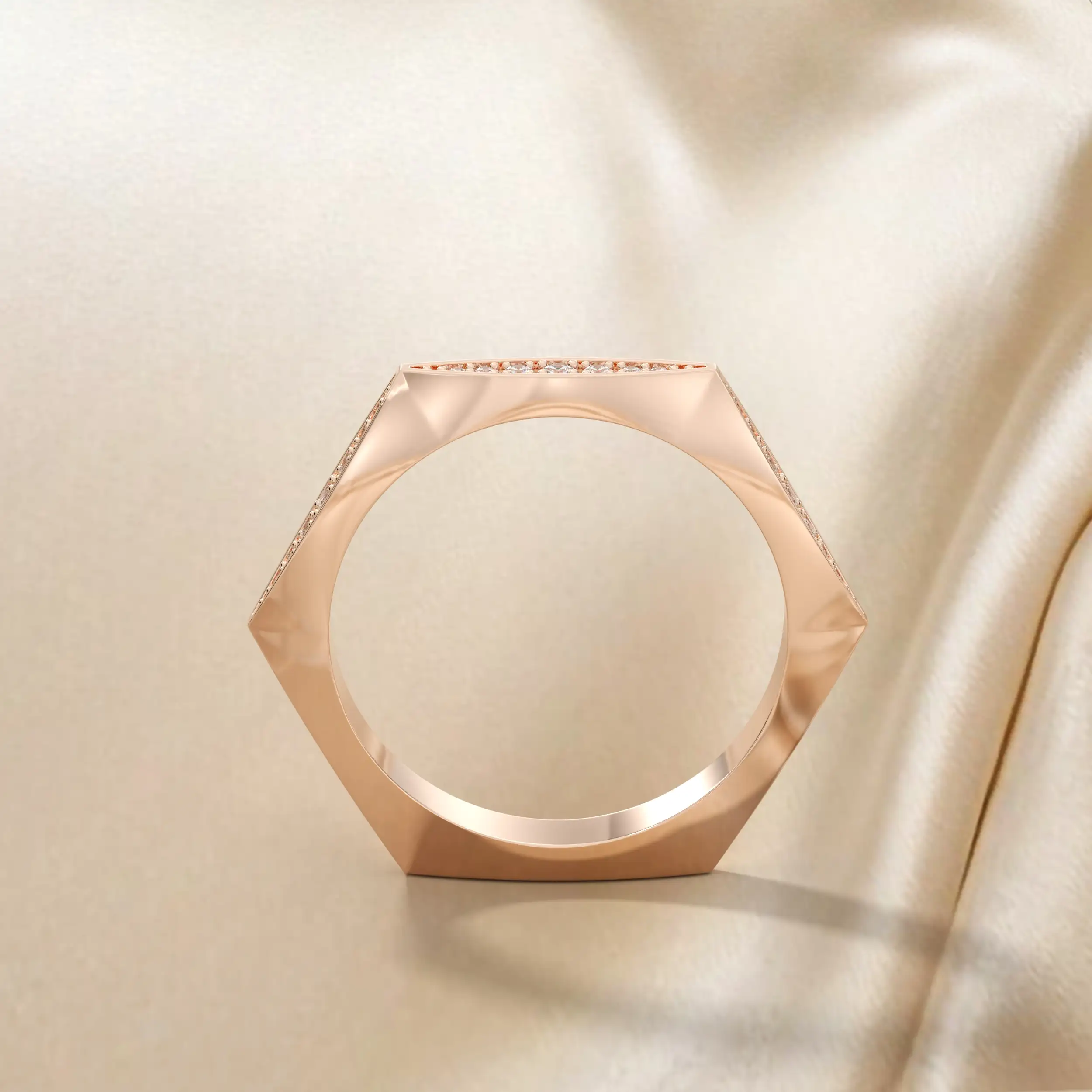 טבעת בצורת משושה עם שיבוץ יהלומים בכל צלע. מייחדת כל מראה.
