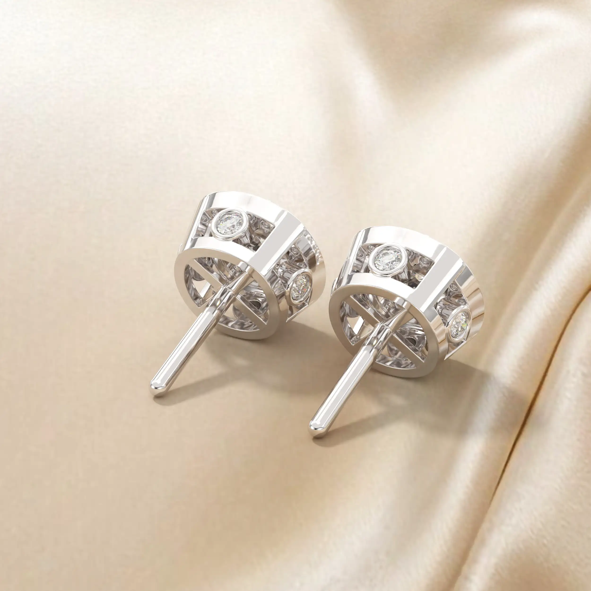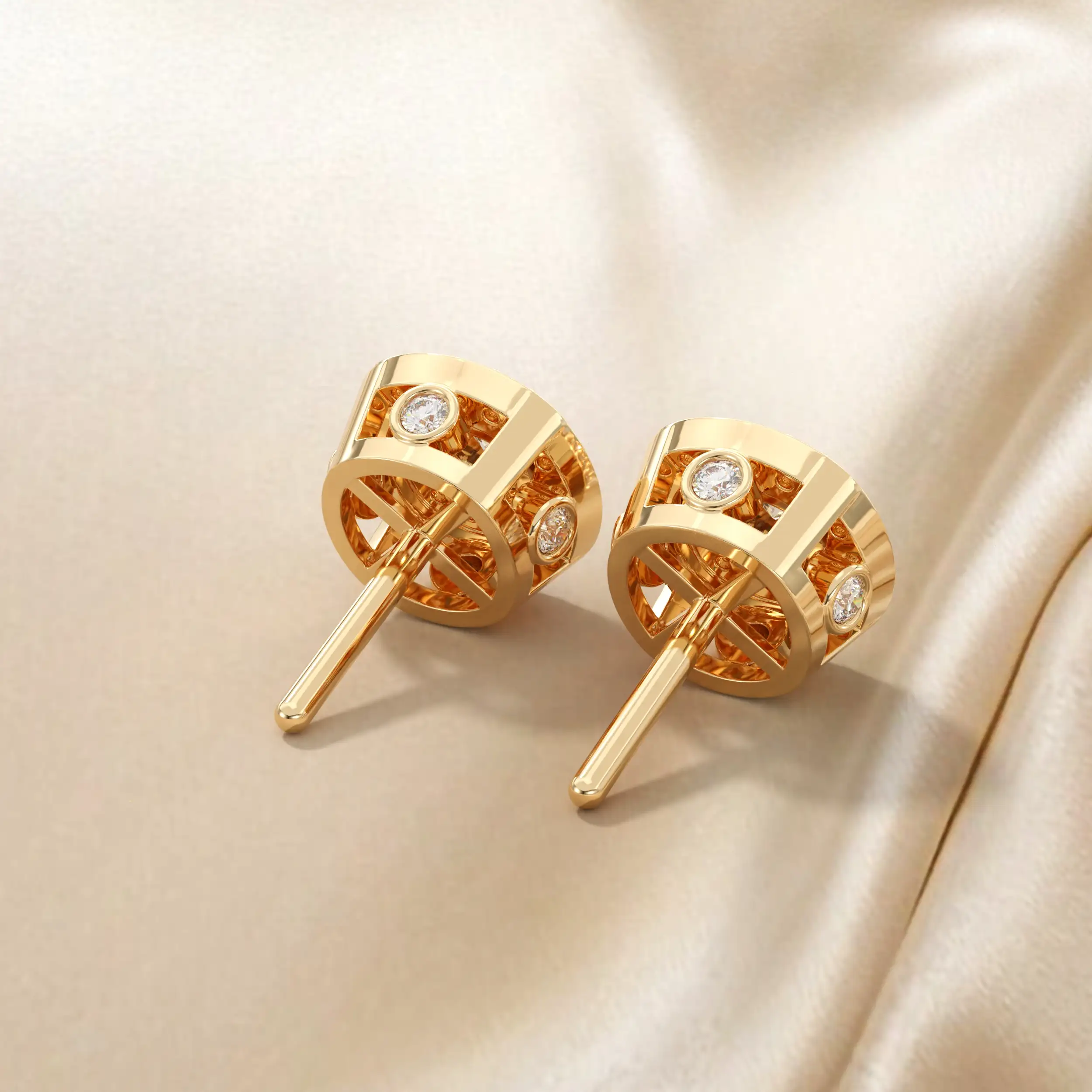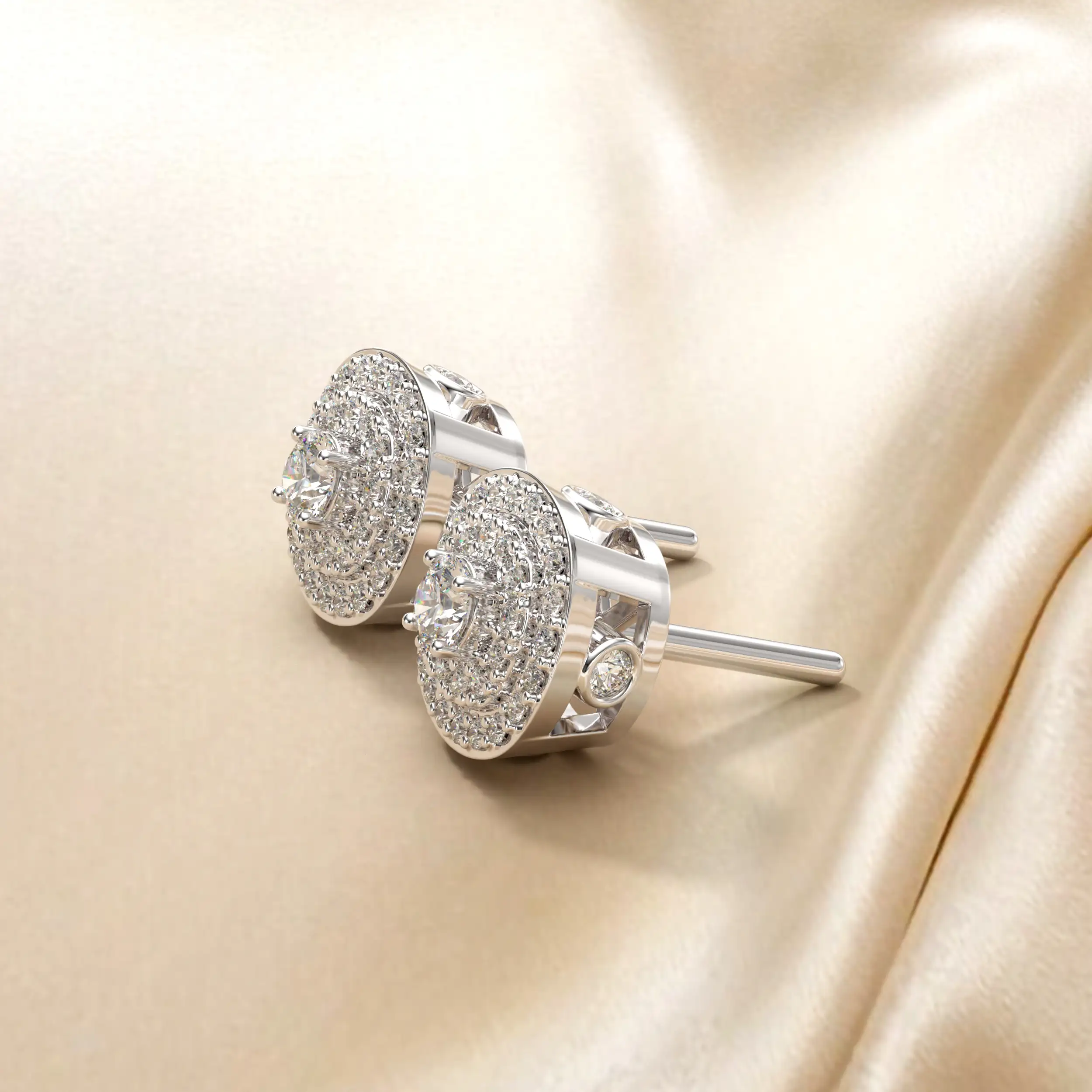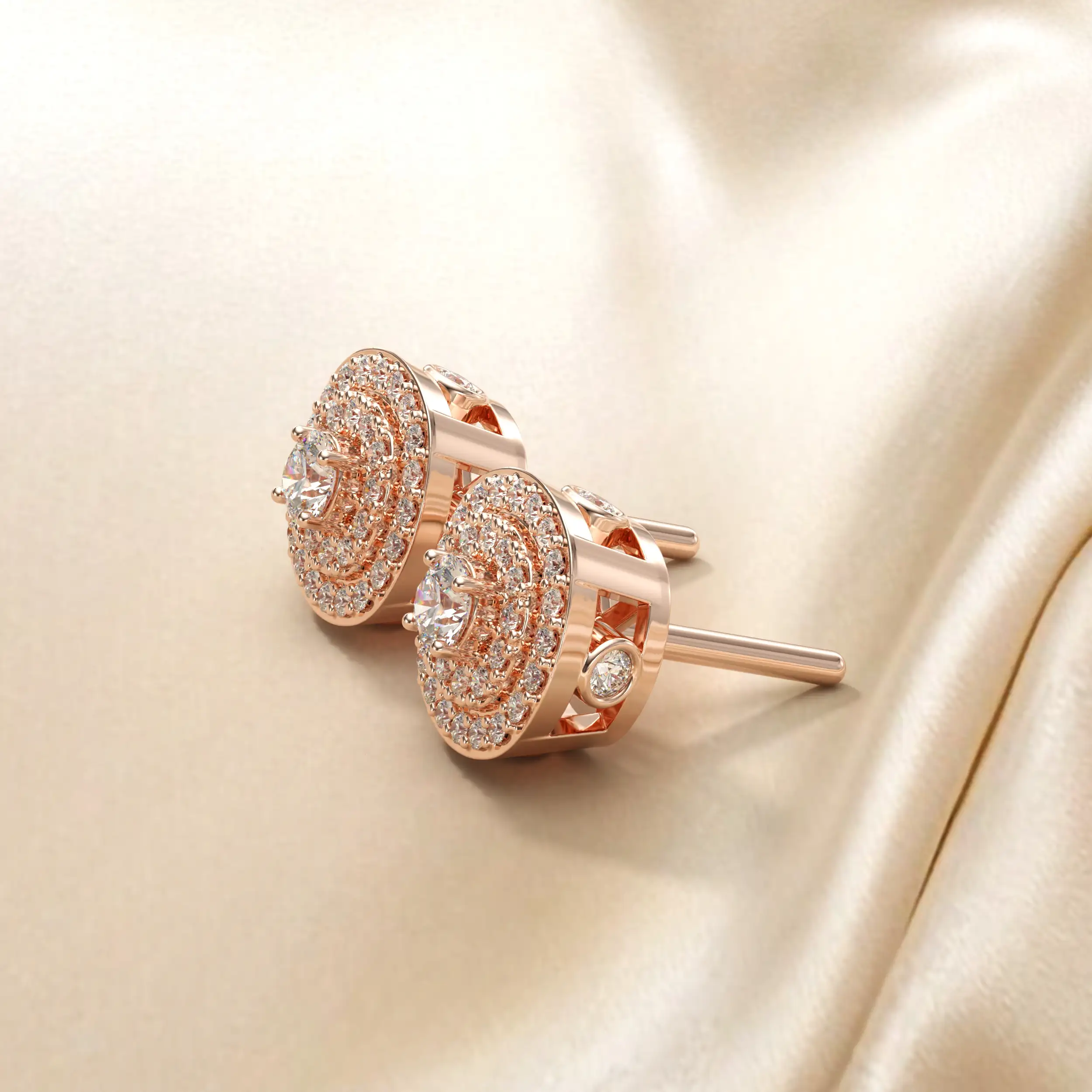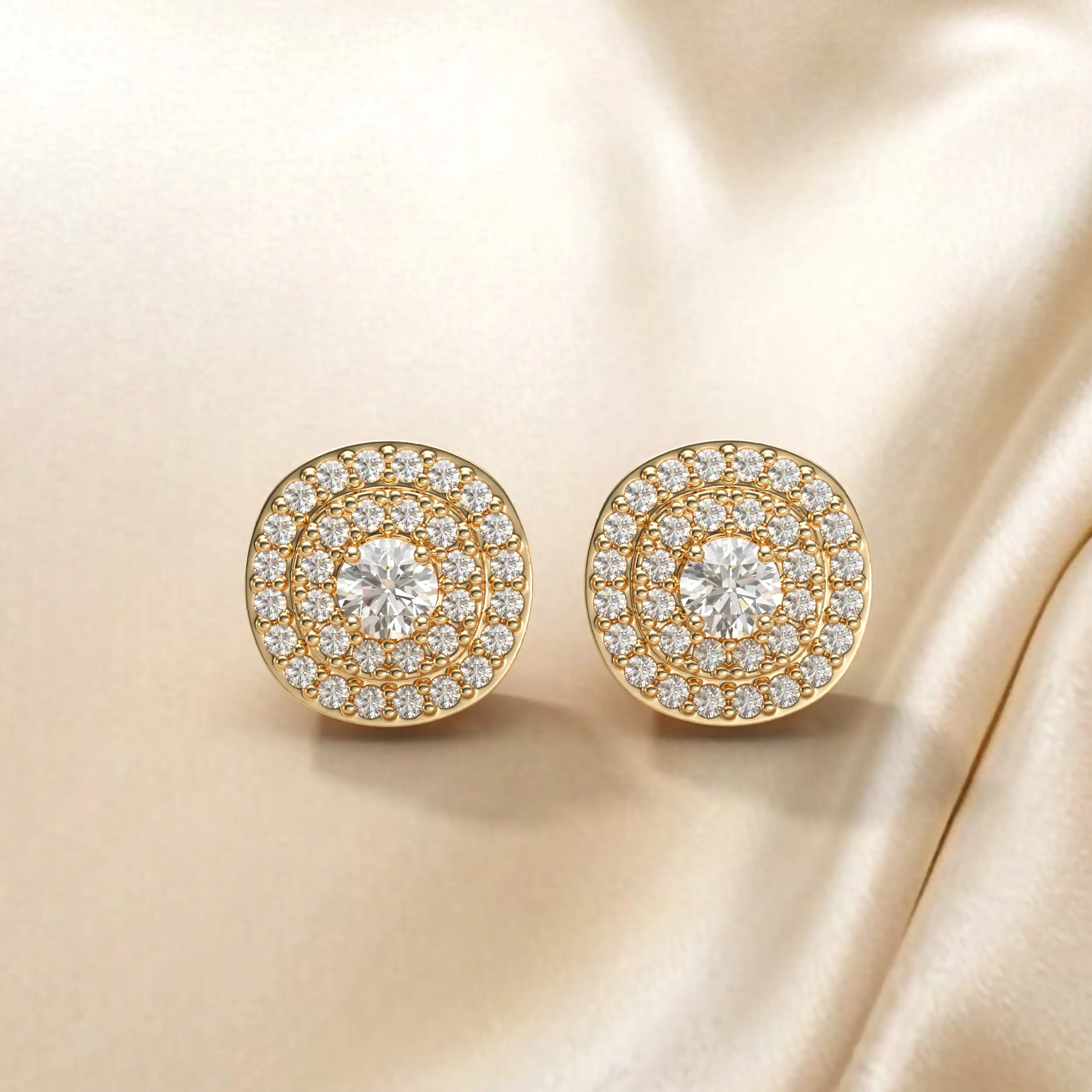 עגילים צמודים עם אבן מרכזית והילת יהלומים כפולה מסביב, לאחת שרוצה נוכחות.